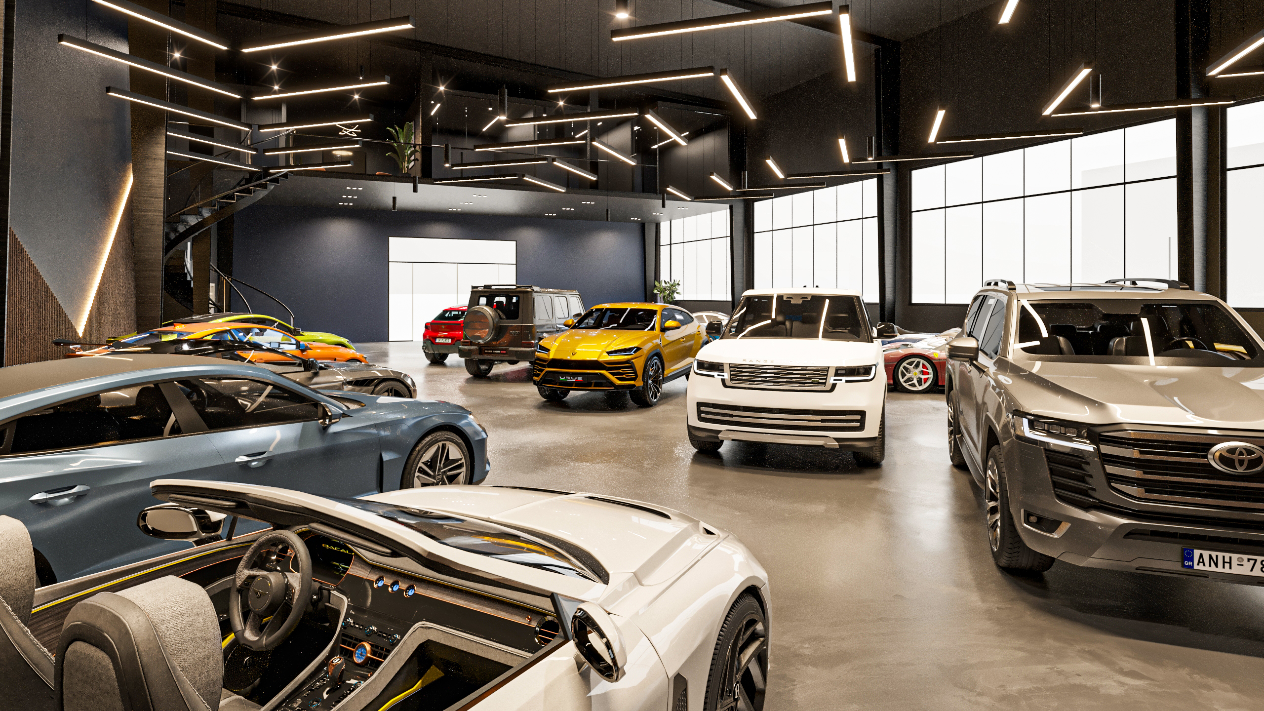 This interior design project for a car showroom presents a sleek, modern environment that highlights the elegance and innovation of the vehicles on display. The design focuses on creating a spacious, gallery-like atmosphere with clean lines, high ceilings, and expansive glass facades that flood the space with natural light. Polished flooring, minimalistic furnishings, and strategically placed lighting draw attention to each vehicle, allowing them to take center stage. Interactive digital displays and lounge-style waiting areas enhance the customer experience, while premium finishes and subtle branding elements reinforce the identity of the automotive brand. The result is a refined, high-impact showroom that elevates both the presentation of the cars and the overall customer journey.